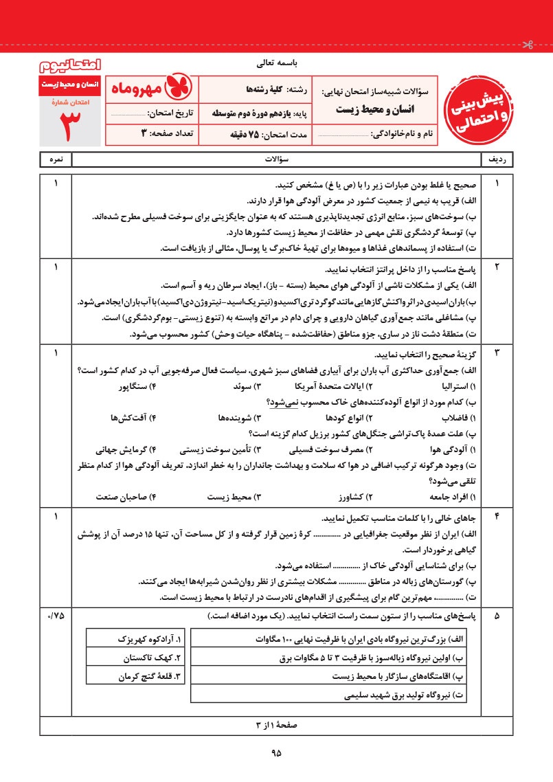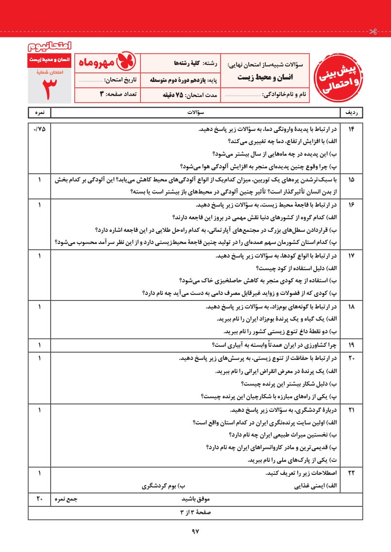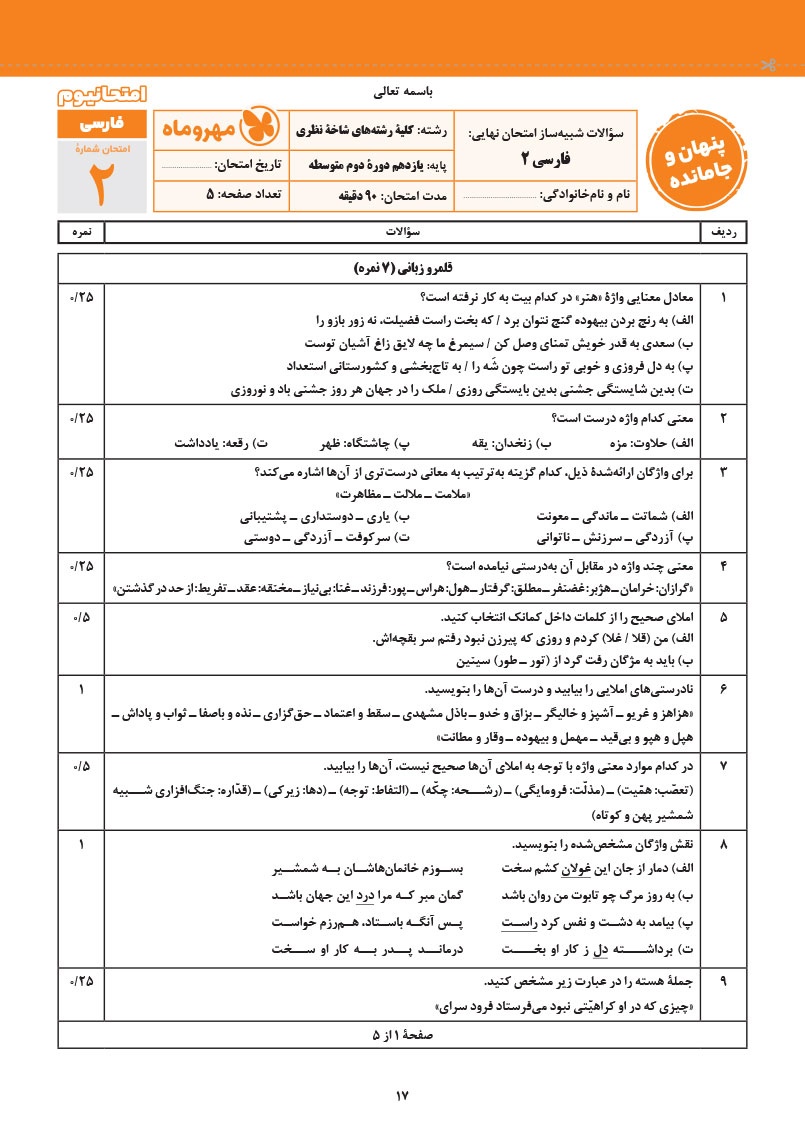 سوالات این امتحان ، از مباحثی تالیف شده است که کمتر در امتحانات نهایی مورد پرسش قرار گرفته اند ، اما اهمیت سنجش بالایی دارند. با پاسخگویی به این سوالات ، دیگر سر جلسه ی امتحان نهایی ، غافلگیر نخواهید شد.