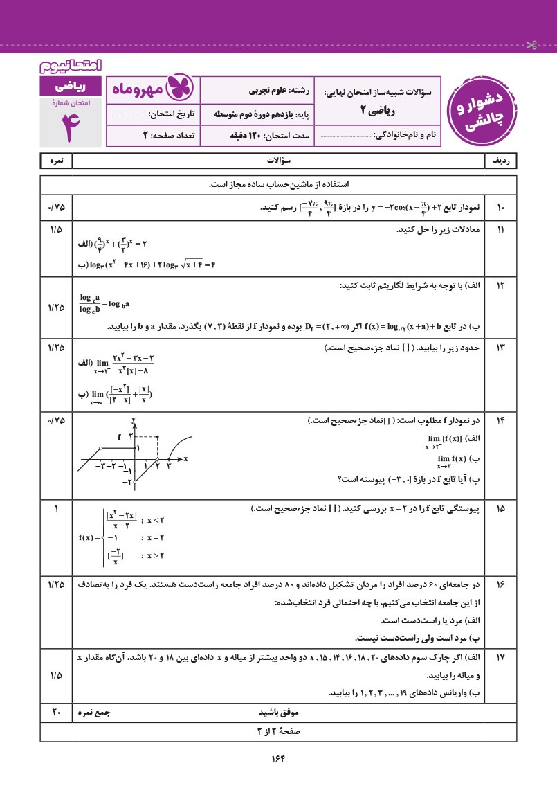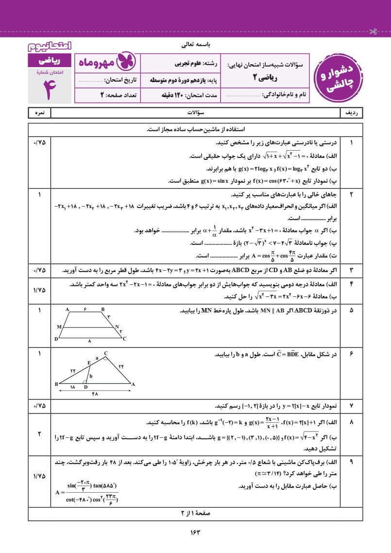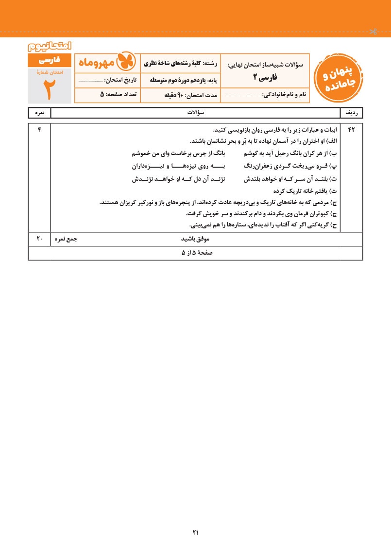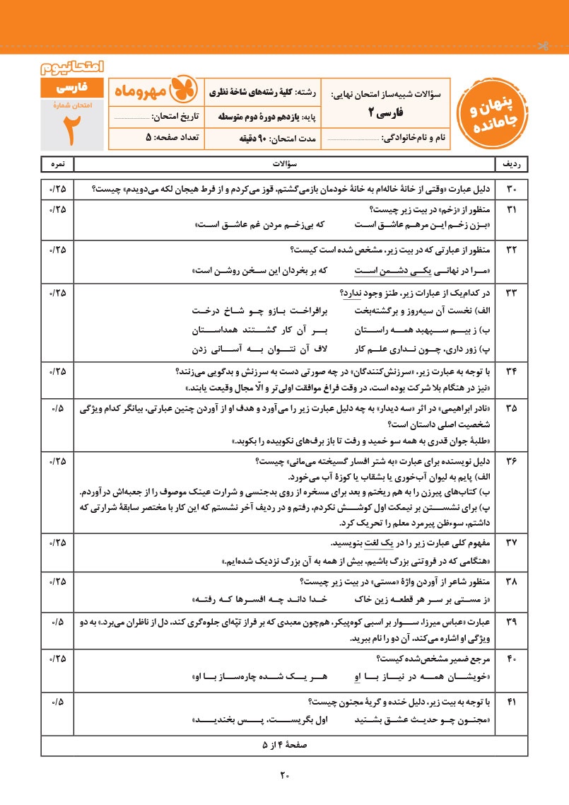 سوالات این امتحان ، از مباحثی تالیف شده است که کمتر در امتحانات نهایی مورد پرسش قرار گرفته اند ، اما اهمیت سنجش بالایی دارند. با پاسخگویی به این سوالات ، دیگر سر جلسه ی امتحان نهایی ، غافلگیر نخواهید شد.
