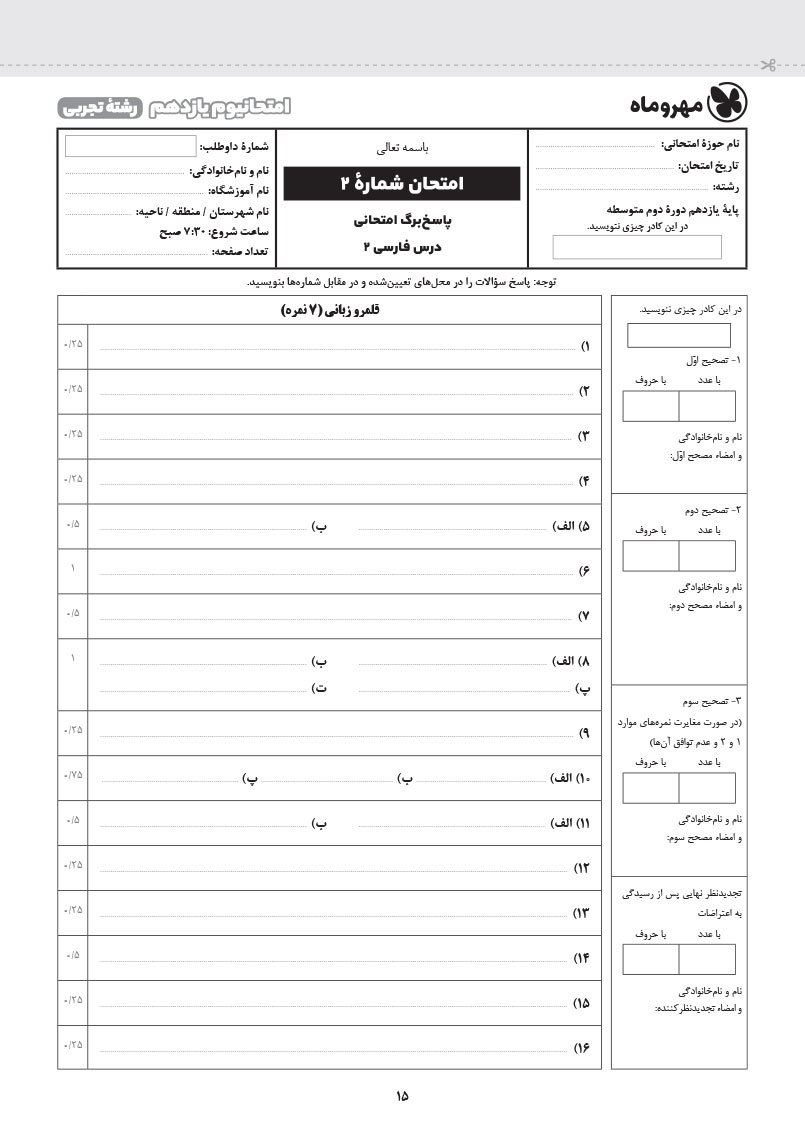 - پاسخبرگ های خام ویژه هر امتحان به صورت مجزا و دارای خط برش (پرفراژدار)