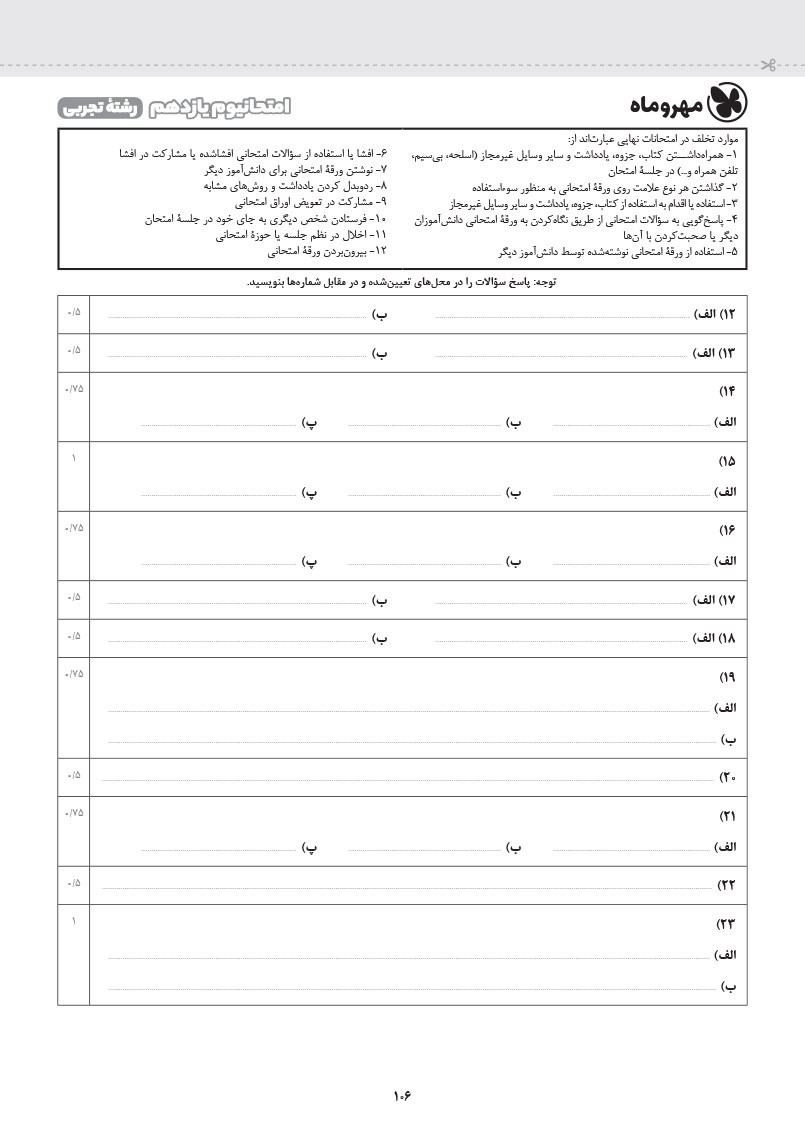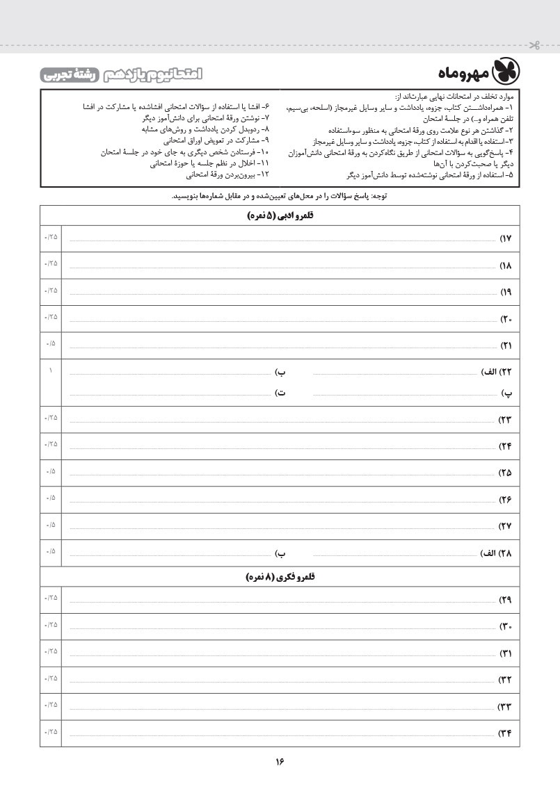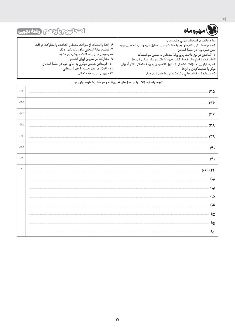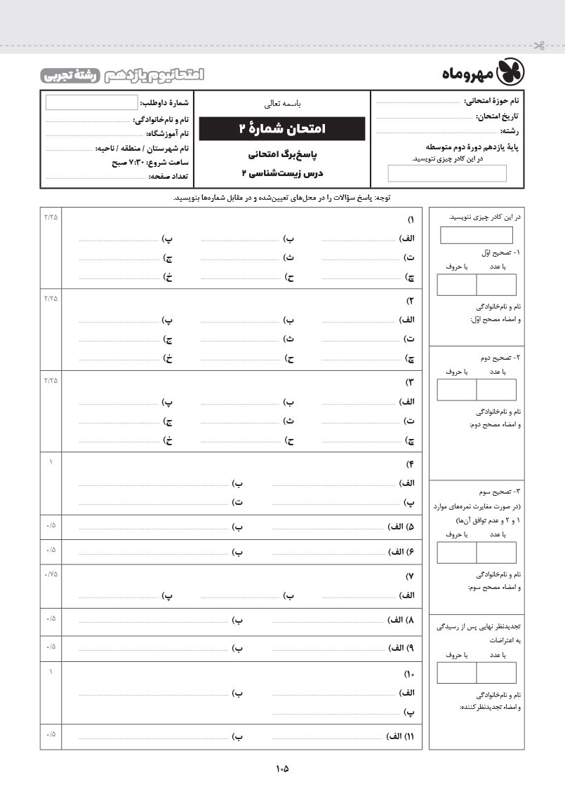 - دفترچه ی پاسخبرگ، برای شبیه سازی هر چه بیشتر جلسه ی امتحان