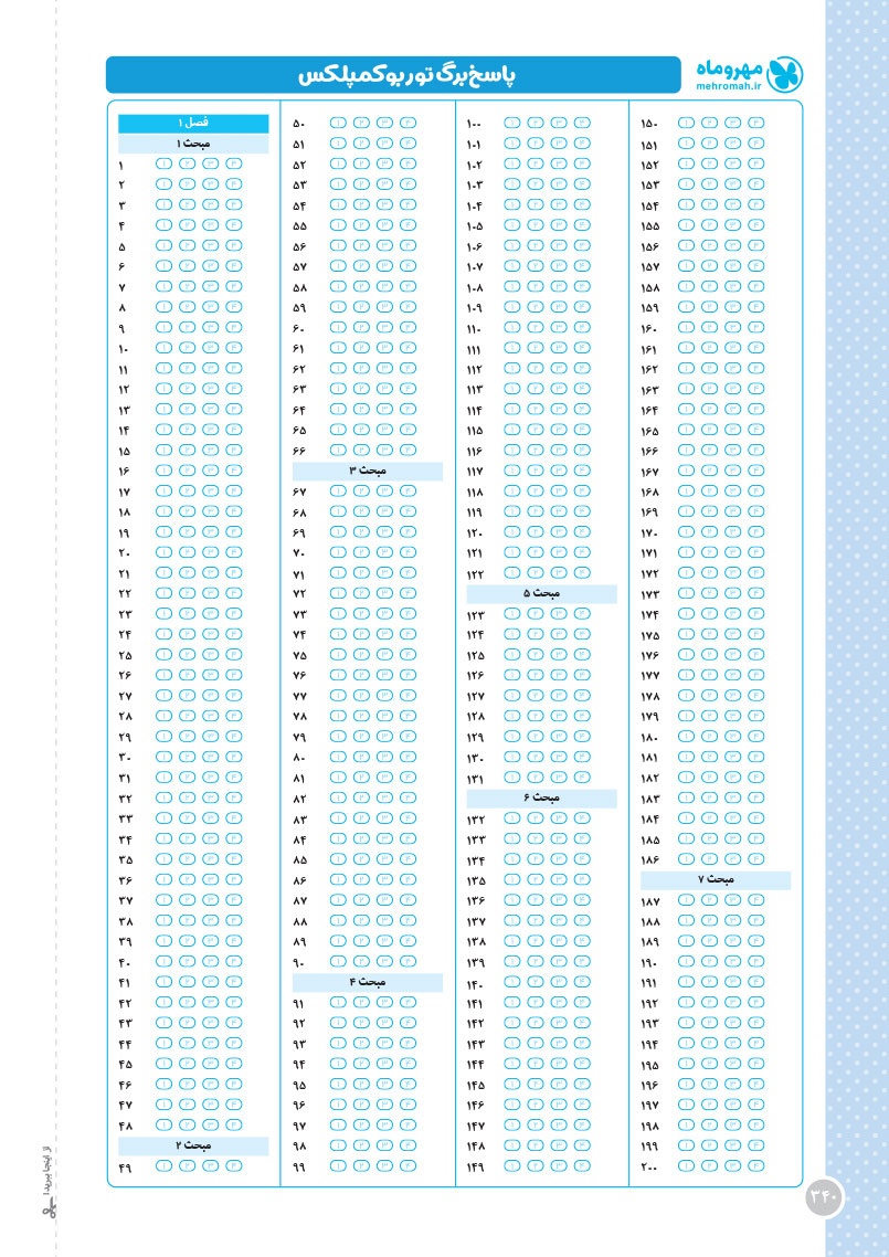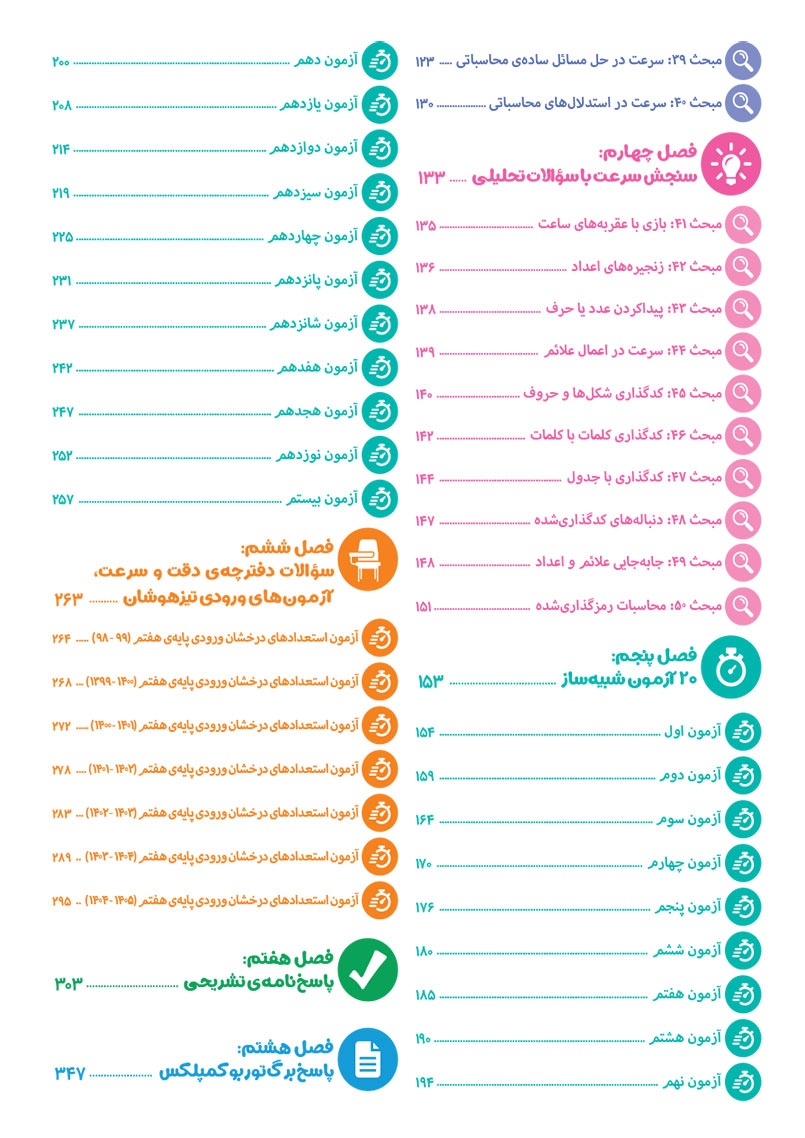 ویژگی های منحصر به فرد کتاب توربو کمپلکس تیزهوشان ششم: - شامل بیش از 1230 سوال چهارگزینهای سرعت و دقت ریزطبقهبندی شده در قالبهای کلامی، تصویری، محاسباتی و تحلیلی - 1200 سوال چهارگزینهای در قالب 20 آزمون 60 تستی شبیه سازی شده با دفترچه ی سرعت و دقت آزمون تیزهوشان ششم به هفتم - 380 سوال آزمون های ورودی تیزهوشان سال های اخیر - پاسخنامه ی کامل برای همه ی سوالات و پاسخ تشریحی برای سوالات نسبتا دشوار -همراه با پاسخ برگ ویژه ی تمامی سوالات