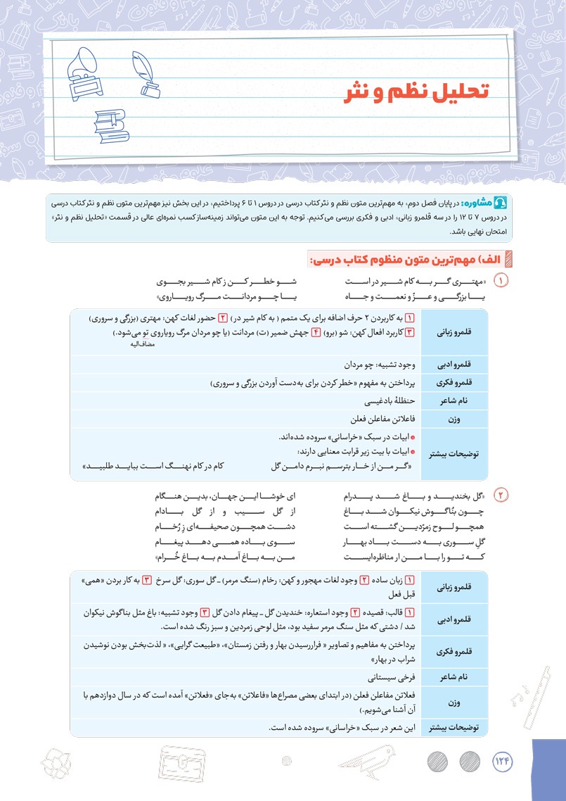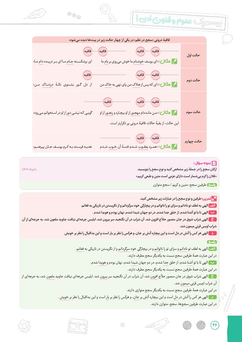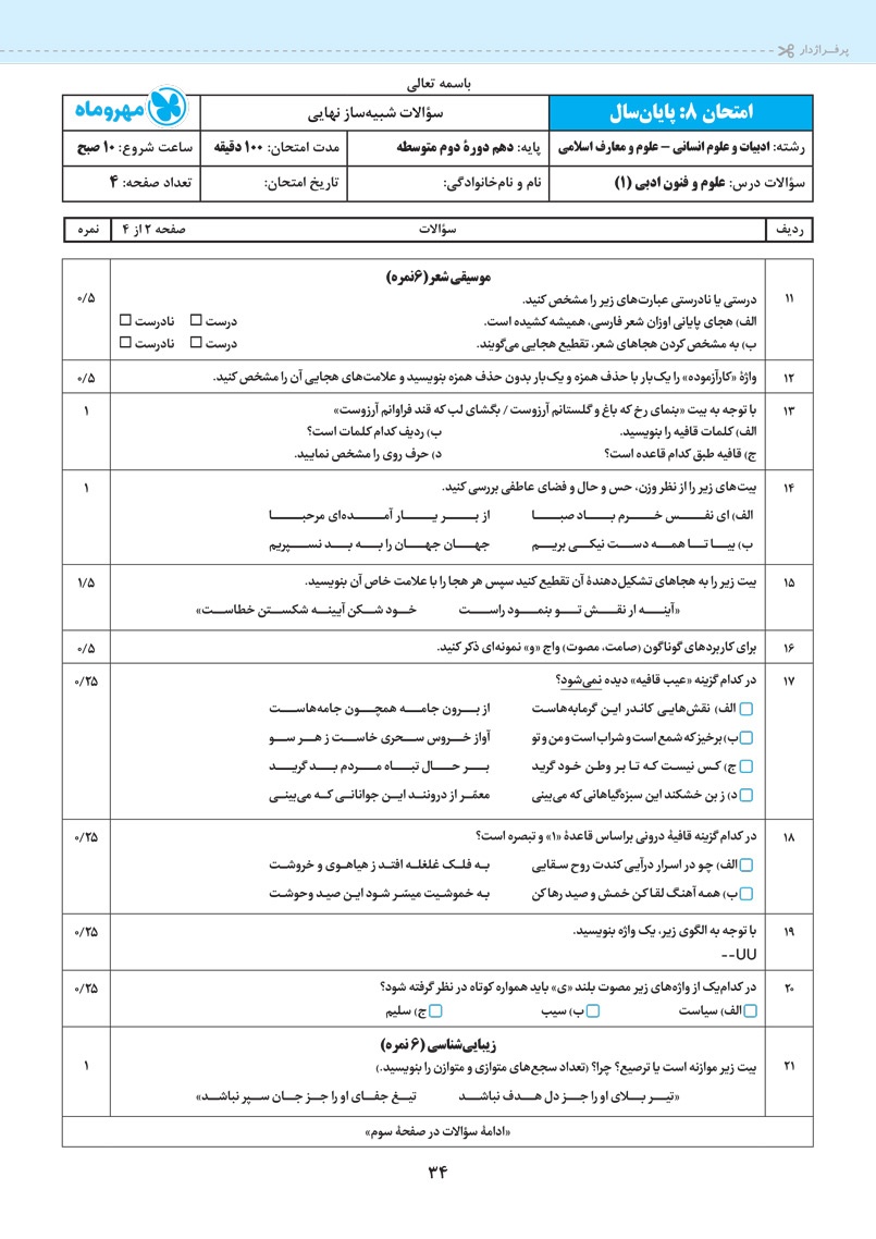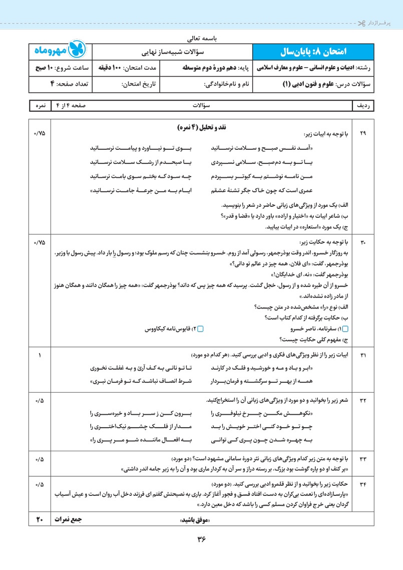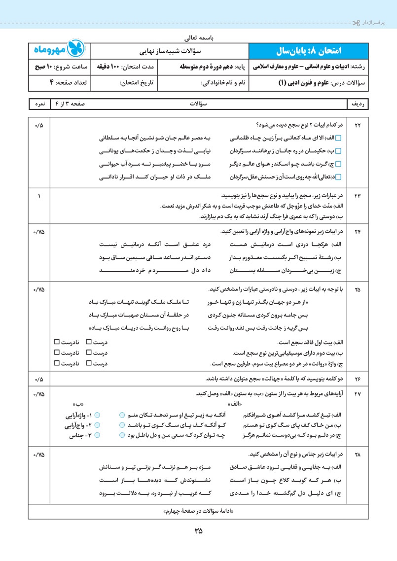 اراءه انواع سوال های جدید رایج و امتحان نهایی برای سوالات درس های مربوط به آرایه های ادبی