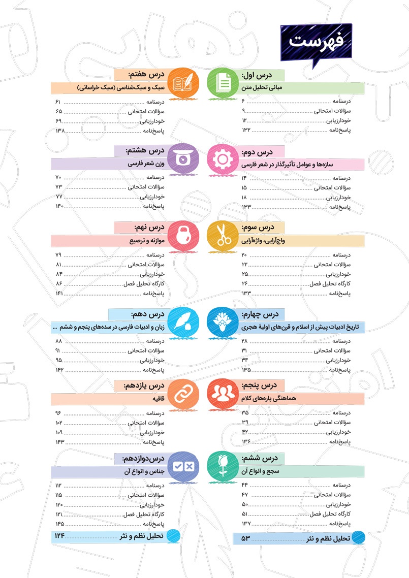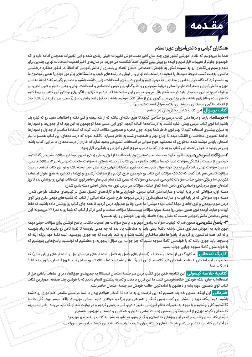 بنابراین پیشنهاد میکنیم پس از مطالعه هر درس از کتاب پرسوال، امتحان همان درس را جدا کنید و در شرایط مشابه نهایی از خودتان امتحان بگیرید و سپس با توجه به بارم بندی هر سوال در پاسخ نامه، برگه خود را تصحیح و تحلیل کنید.