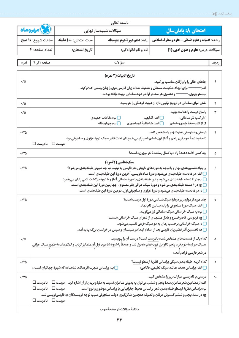 - 10 کاربرگ امتحانی