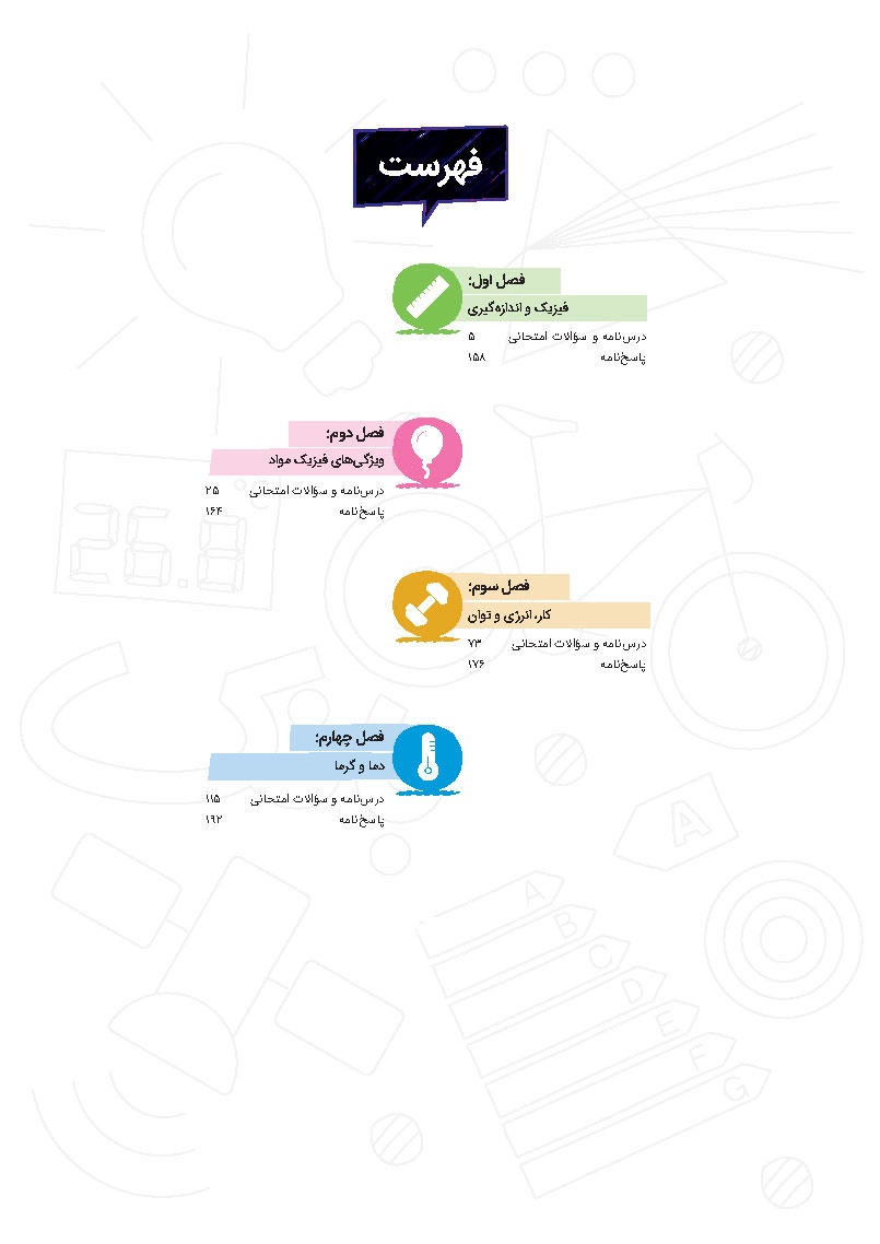 بنابراین پیشنهاد میکنیم پس از مطالعه هر فصل از کتاب پرسوال، امتحان همان فصل را جدا کنید و در شرایط مشابه حوزه امتحانی خودتان را محک بزنید بعد از امتحان نیز با توجه به بارم بندی هر سوال در پاسخ نامه، برگه خود را تصحیح و تحلیل کنید.