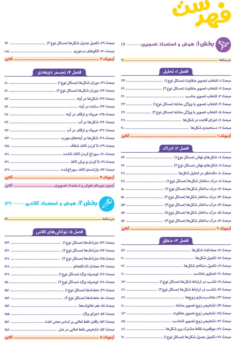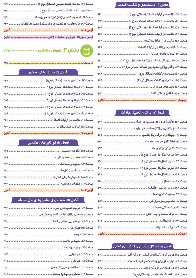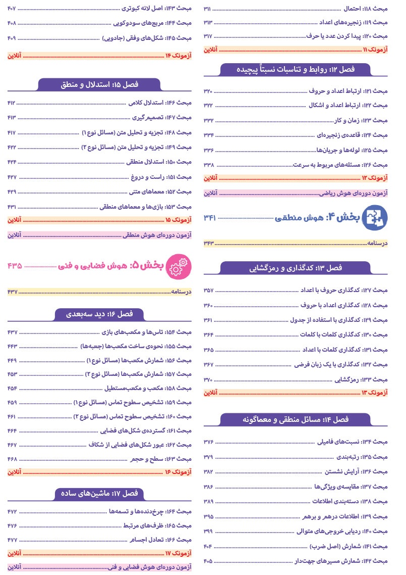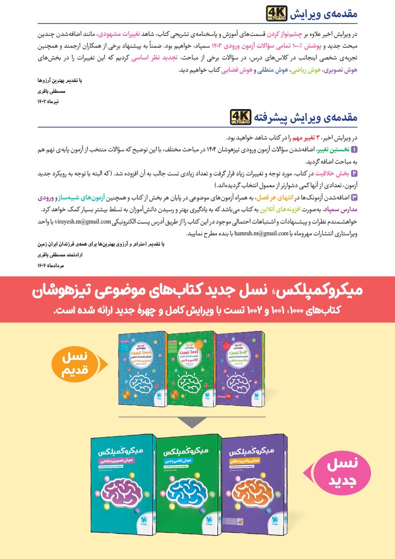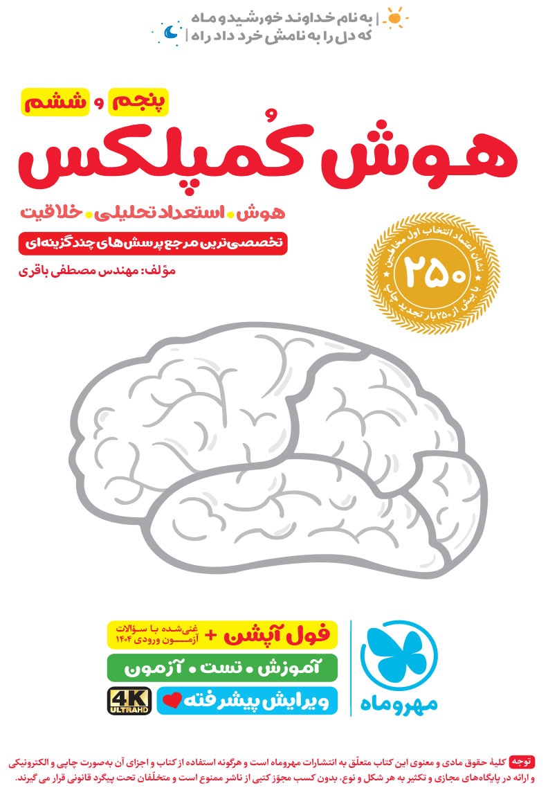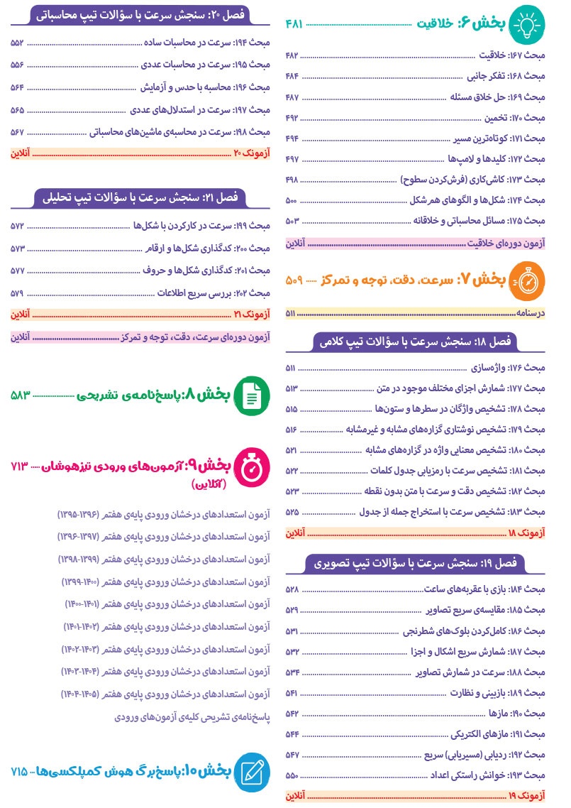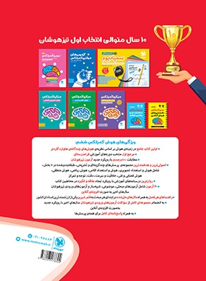 - مرجع اول منتخب دوره های آموزشی فرامدرسه ای - مطابقت 100 درصدی با رویکرد جدید آزمون تیزهوشان - اصولی ترین و هدفمند ترین مجموعهی پرسشهای چندگزینهای و تشریحی، طبقهبندی شده در 10 بخش، شامل هوش و استعداد تصویری، هوش و استعداد کلامی، هوش ریاضی، هوش منطقی، هوش فضایی و فنی، خلاقیت و سرعت، دقت، توجه و تمرکز - روان ترین درسنامه های آموزشی با رویکرد ایجاد علاقه و انگیزه در مخاطبین کتاب - 40 آزمون شامل آزمون ها مبحثی، موضوعی، شبیه ساز، آزمون های ورودی تیزهوشان سال های اخیر - راهنماهای هر فصل به همراه مثالهای حلشده در ابتدای هر مبحث به قلم شیرین یکی از ارزشمندترین استادان کشور - به انضمام مجموعه ای کامل از سوالات آزمون های ورودی تیزهوشان سال های اخیر با رویکرد جدید به صورت افزونهی آنلاین - به همراه پاسخنامهای کامل برای همهی پرسشها