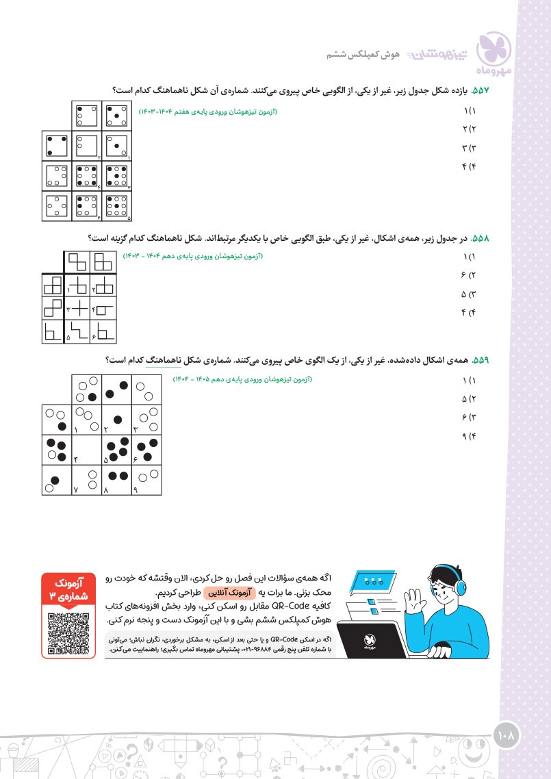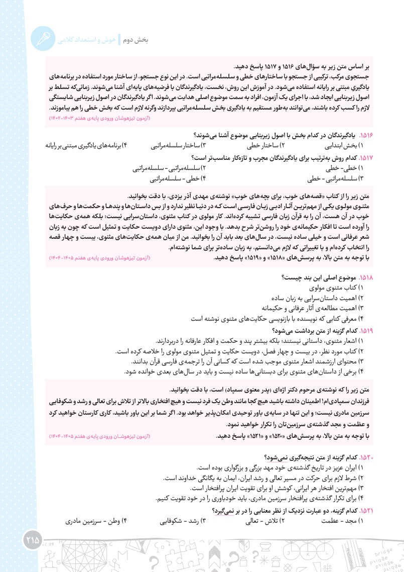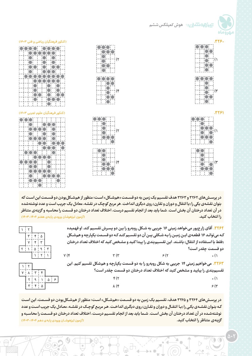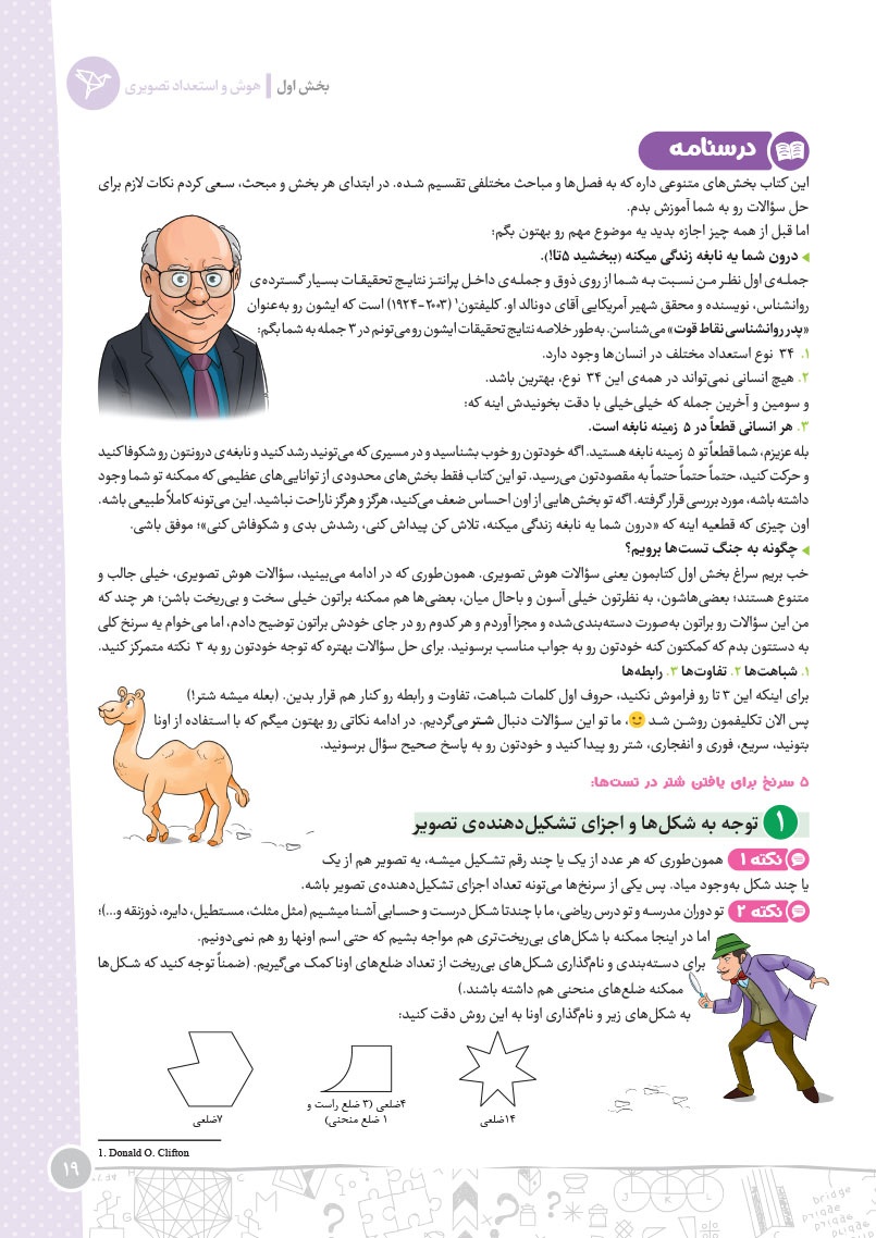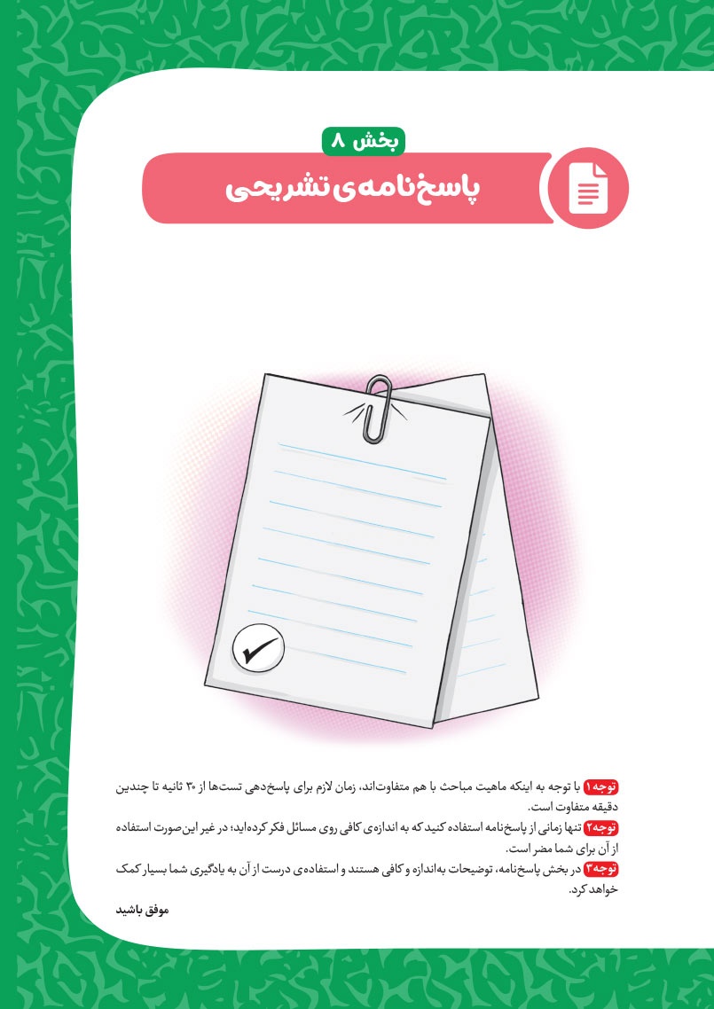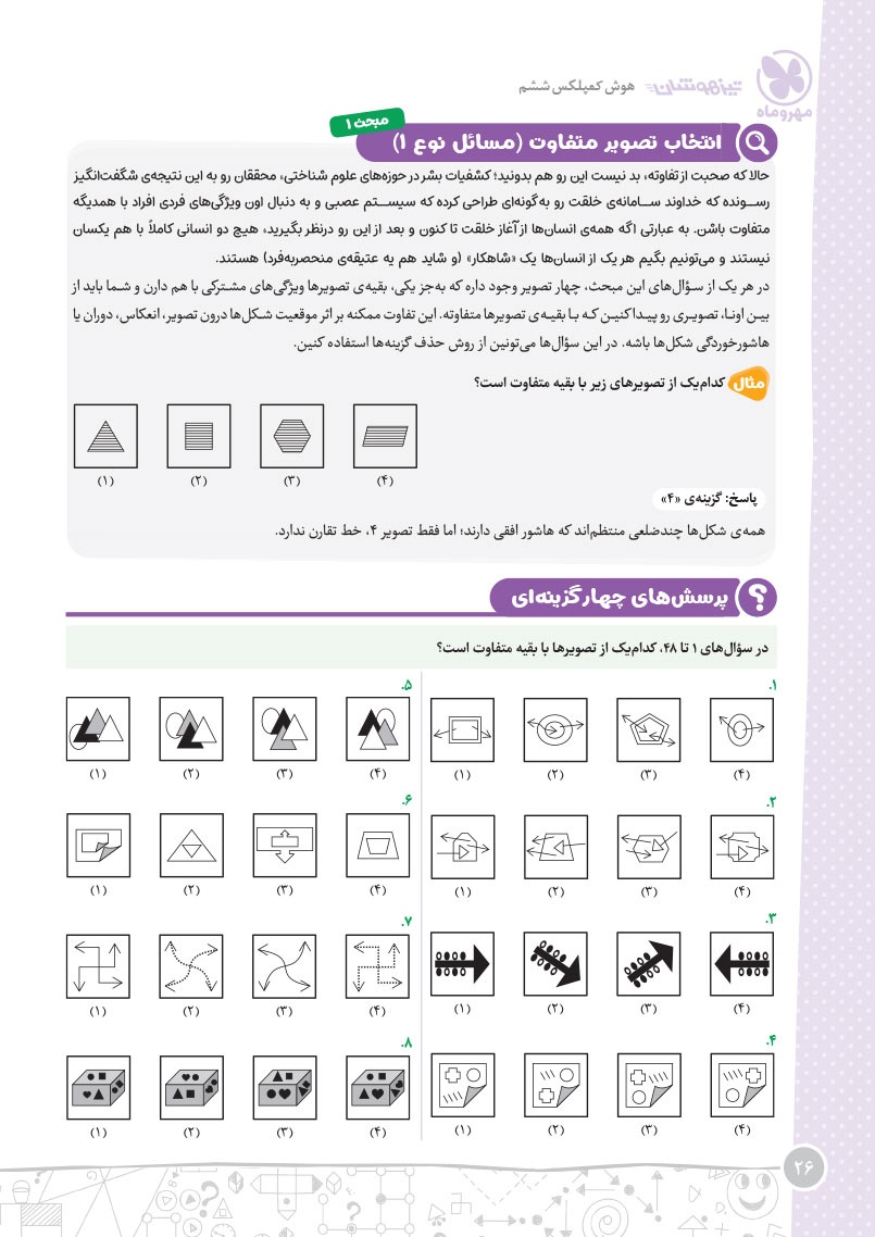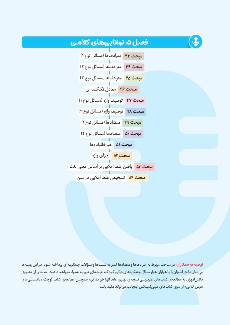 - مرجع اول منتخب دوره های آموزشی فرامدرسه ای - مطابقت 100 درصدی با رویکرد جدید آزمون تیزهوشان - اصولی ترین و هدفمند ترین مجموعهی پرسشهای چندگزینهای و تشریحی، طبقهبندی شده در 10 بخش، شامل هوش و استعداد تصویری، هوش و استعداد کلامی، هوش ریاضی، هوش منطقی، هوش فضایی و فنی، خلاقیت و سرعت، دقت، توجه و تمرکز - روان ترین درسنامه های آموزشی با رویکرد ایجاد علاقه و انگیزه در مخاطبین کتاب - 40 آزمون شامل آزمون ها مبحثی، موضوعی، شبیه ساز، آزمون های ورودی تیزهوشان سال های اخیر - راهنماهای هر فصل به همراه مثالهای حلشده در ابتدای هر مبحث به قلم شیرین یکی از ارزشمندترین استادان کشور - به انضمام مجموعه ای کامل از سوالات آزمون های ورودی تیزهوشان سال های اخیر با رویکرد جدید به صورت افزونهی آنلاین - به همراه پاسخنامهای کامل برای همهی پرسشها