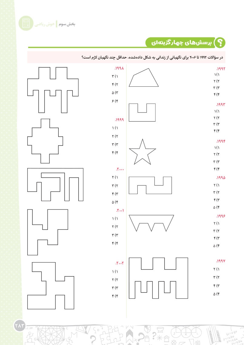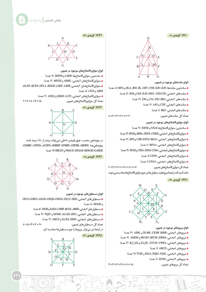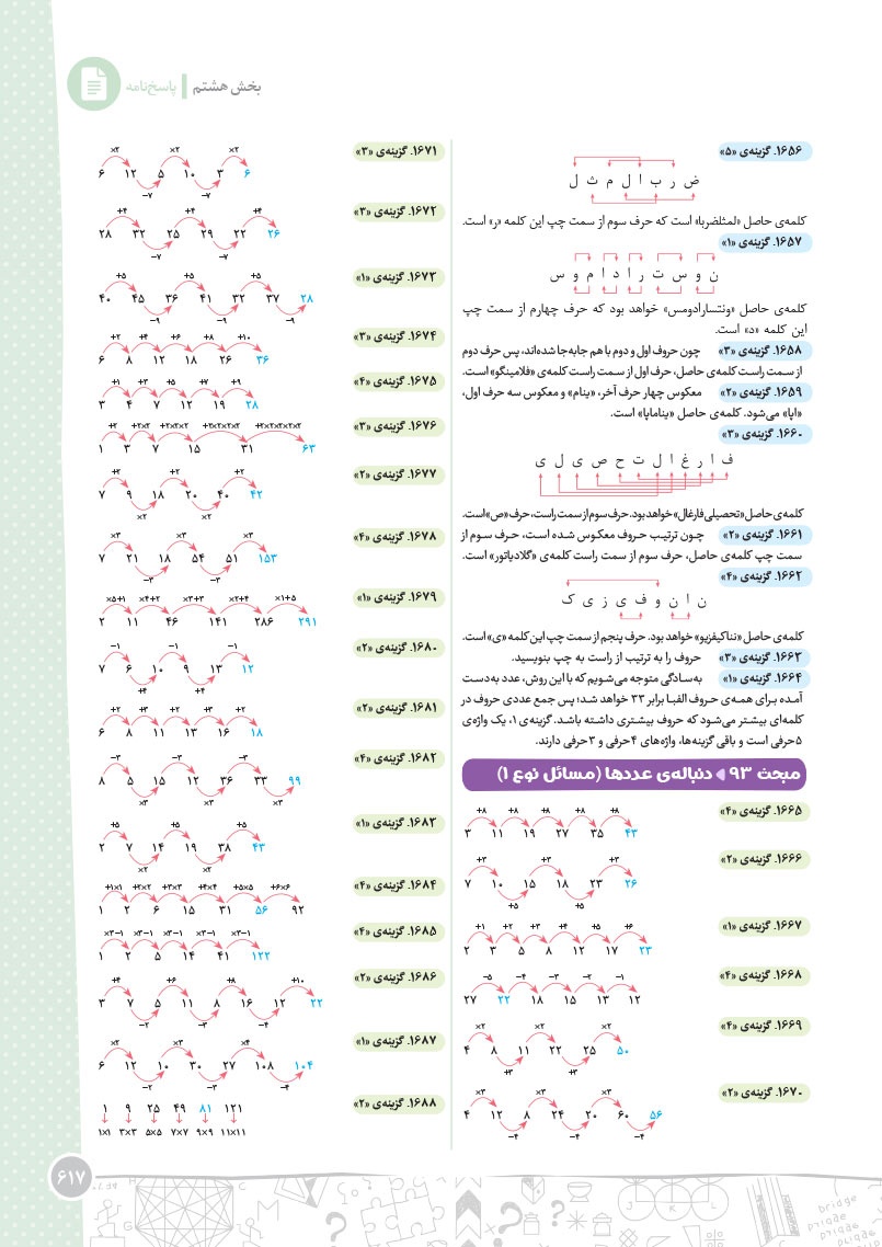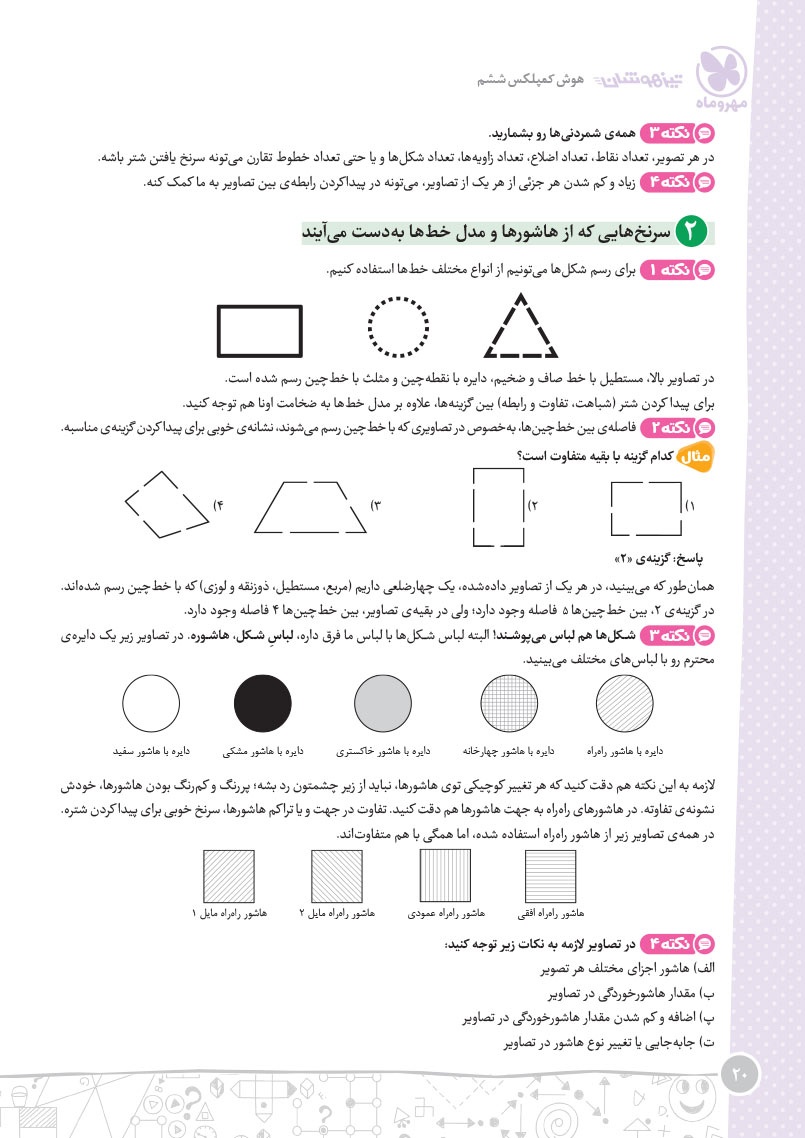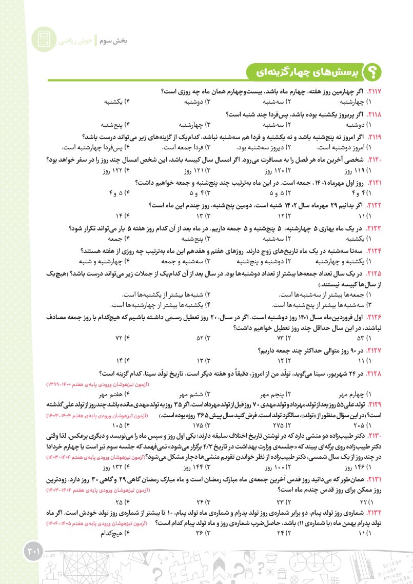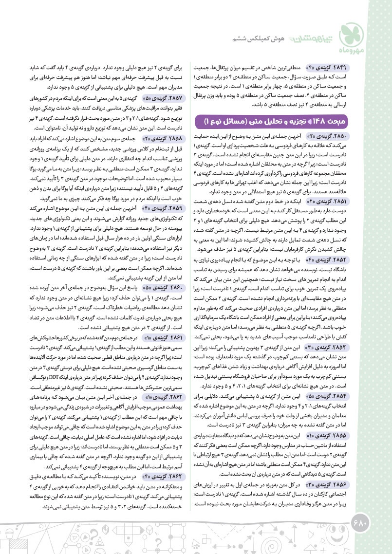 - مرجع اول منتخب دوره های آموزشی فرامدرسه ای - مطابقت 100 درصدی با رویکرد جدید آزمون تیزهوشان - اصولی ترین و هدفمند ترین مجموعهی پرسشهای چندگزینهای و تشریحی، طبقهبندی شده در 10 بخش، شامل هوش و استعداد تصویری، هوش و استعداد کلامی، هوش ریاضی، هوش منطقی، هوش فضایی و فنی، خلاقیت و سرعت، دقت، توجه و تمرکز - روان ترین درسنامه های آموزشی با رویکرد ایجاد علاقه و انگیزه در مخاطبین کتاب - 40 آزمون شامل آزمون ها مبحثی، موضوعی، شبیه ساز، آزمون های ورودی تیزهوشان سال های اخیر - راهنماهای هر فصل به همراه مثالهای حلشده در ابتدای هر مبحث به قلم شیرین یکی از ارزشمندترین استادان کشور - به انضمام مجموعه ای کامل از سوالات آزمون های ورودی تیزهوشان سال های اخیر با رویکرد جدید به صورت افزونهی آنلاین - به همراه پاسخنامهای کامل برای همهی پرسشها