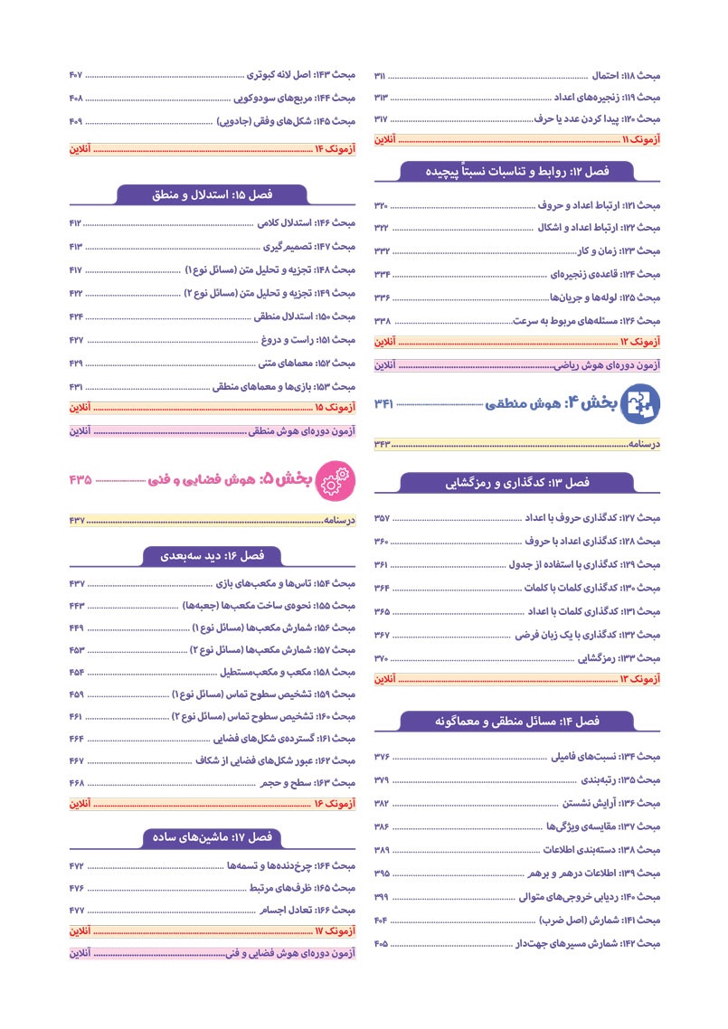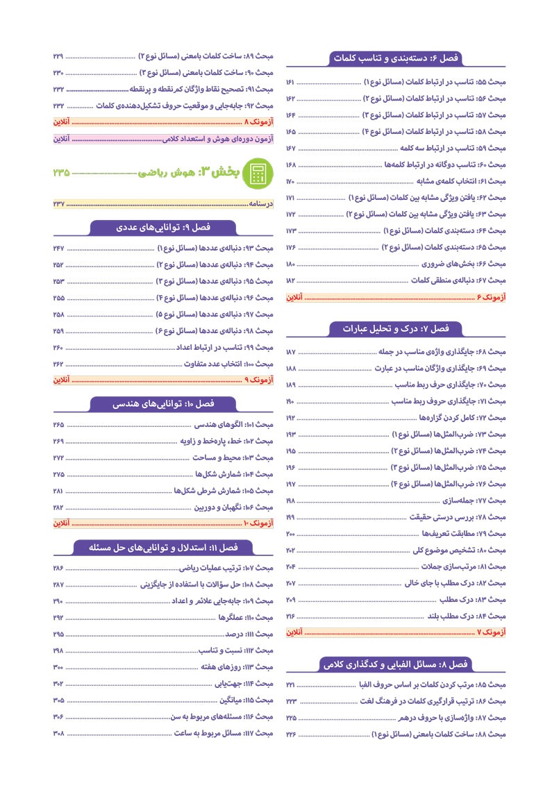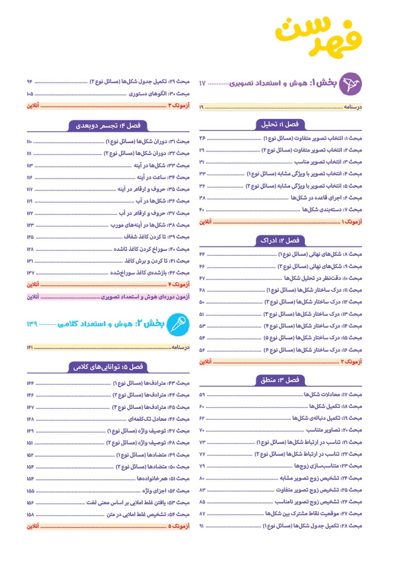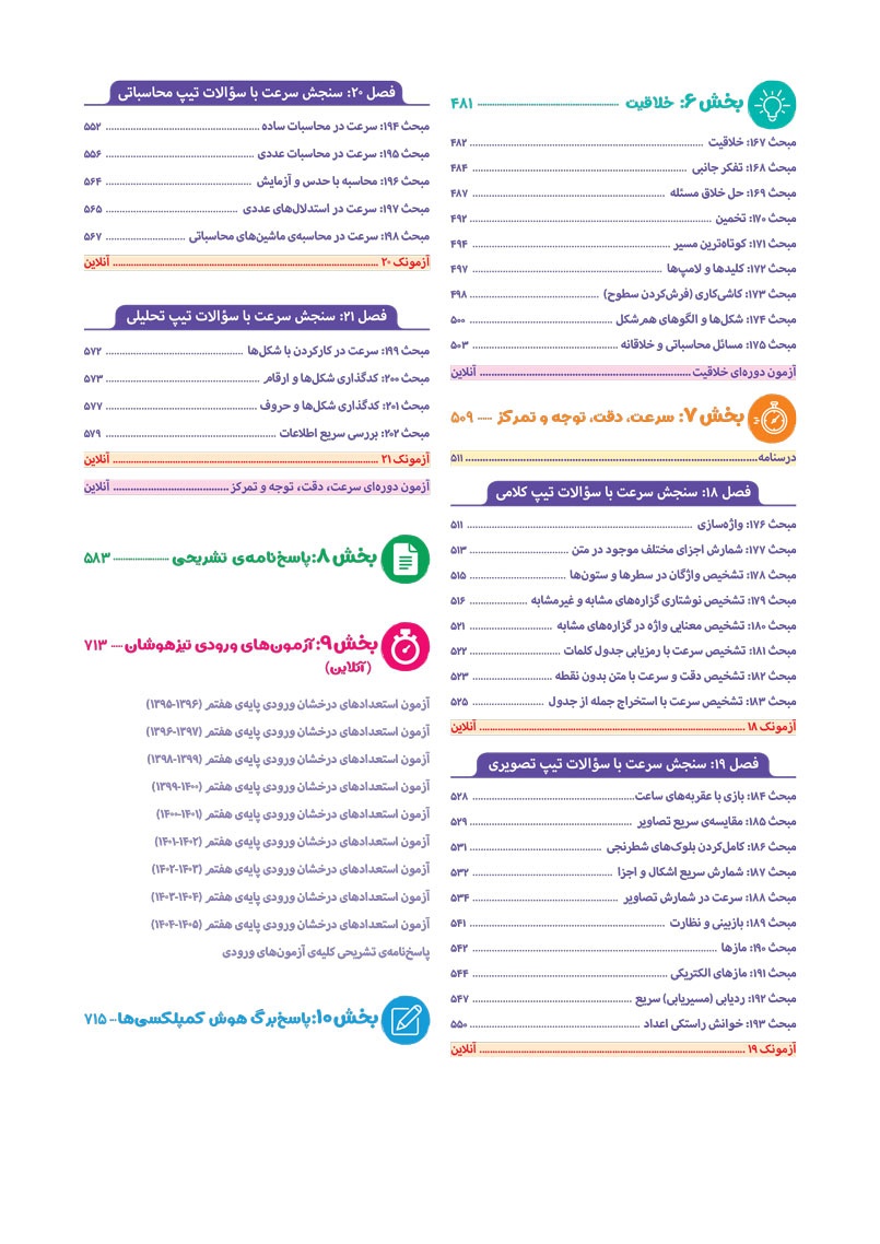 - به انضمام مجموعه ای کامل از سوالات آزمون های ورودی تیزهوشان سال های اخیر با رویکرد جدید به صورت افزونه‌ی آنلاین